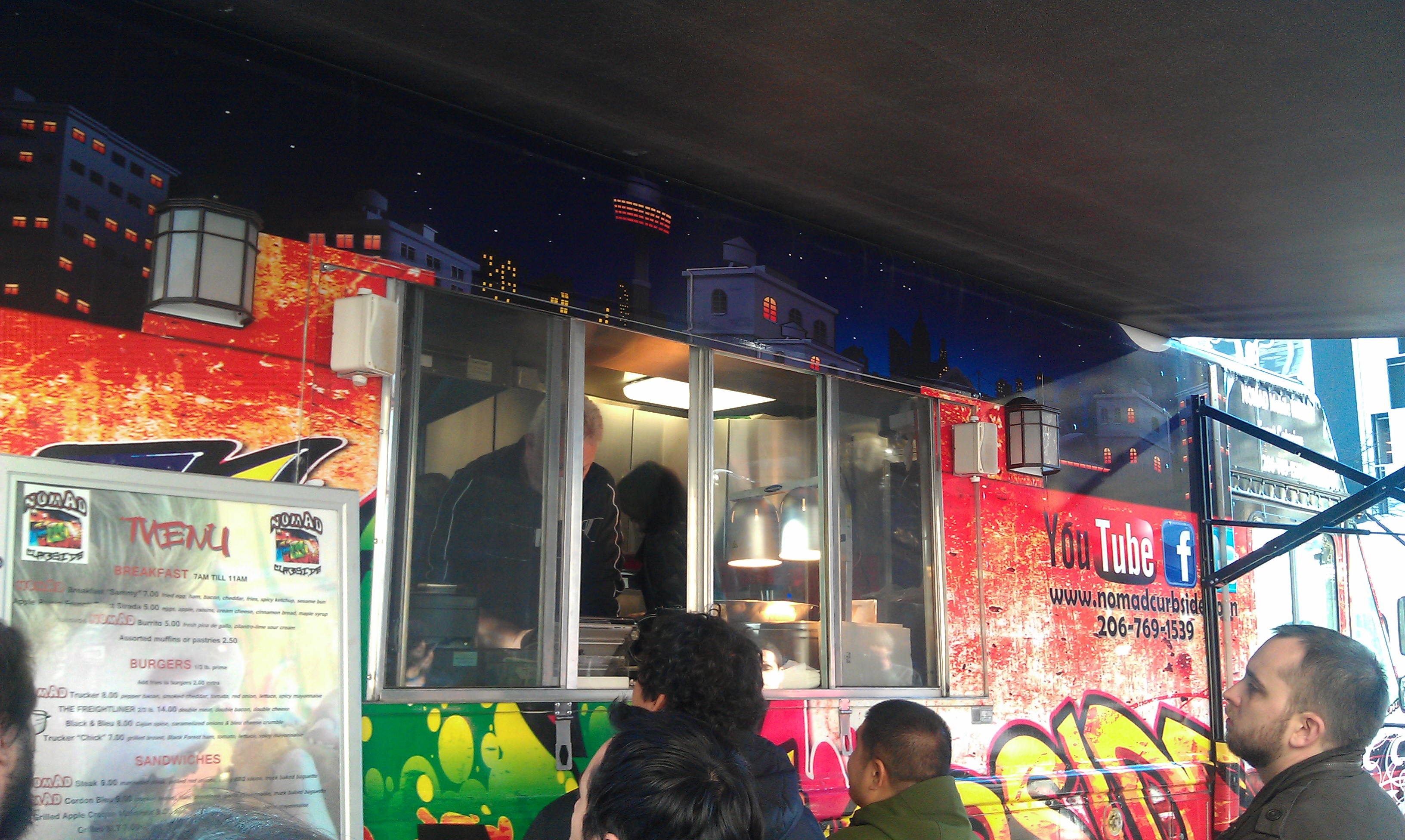 Today for lunch we decided to depart the office building and head down to the food truck pod down the street. This corner has struggled with getting trucks in and being regular, and it seems someone has finally taken the reigns (http://www.2ndandpikeeats.com/). I went for a grilled chicken sandwich at Nomad Curbside while my co-workers opted for Off the Rez tacos.